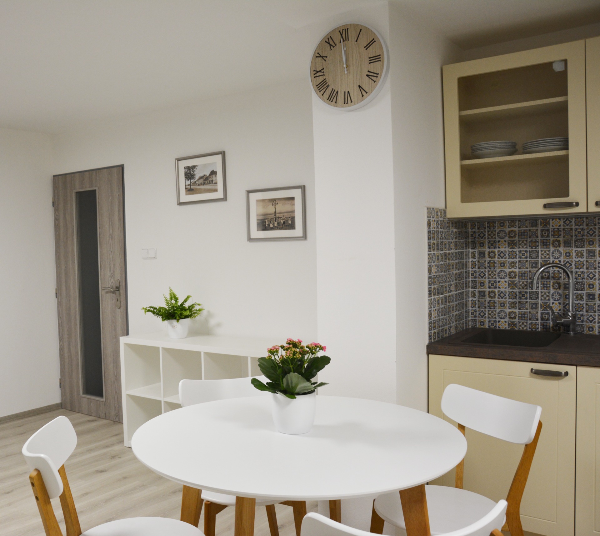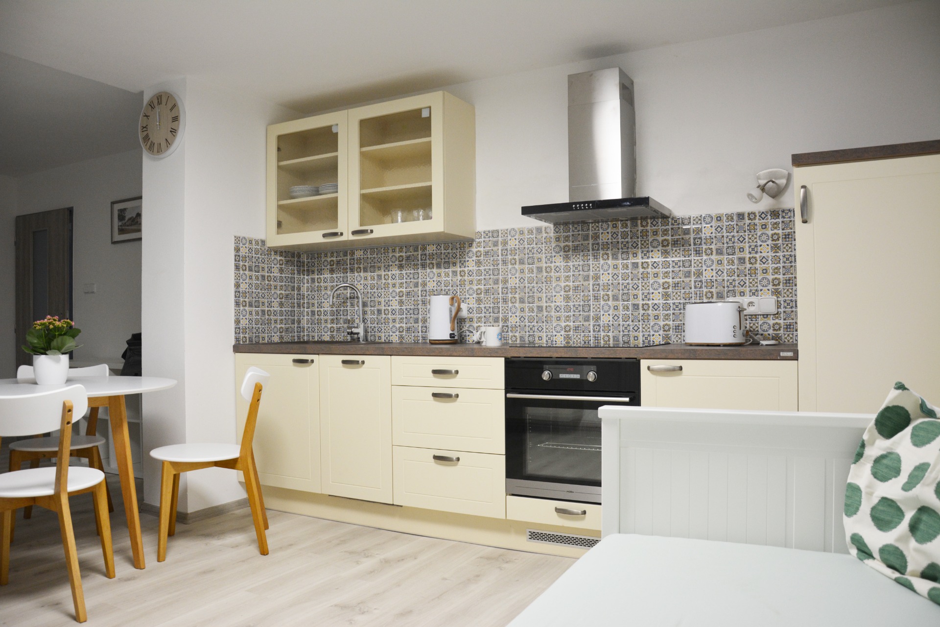 Jídelní kout je vybaven kulatým stolem a čtyřmi židlemi. V obývacím prostoru je sedačka a konferenční stůl.